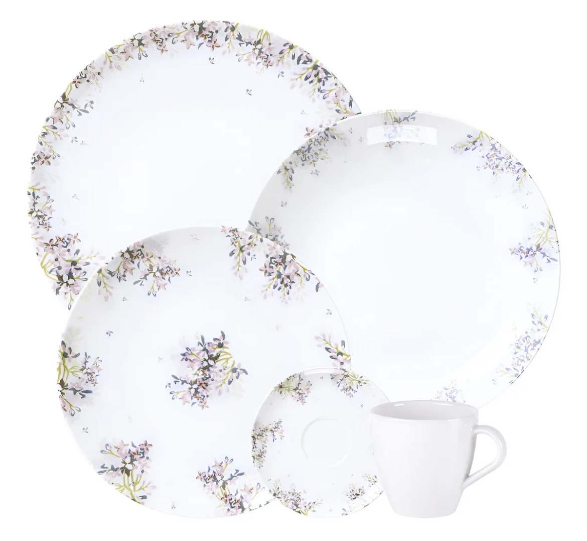 Sendo: 4 pratos rasos, 4 pratos sobremesa, 4 pratos fundo, 4 xícaras e 4 pires