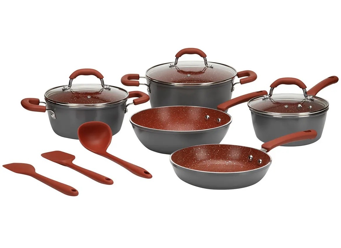 Jogo de 5 panelas de alumínio com revestimento cerâmico + 3 utensílios (espátula, colher e concha em silicone).
