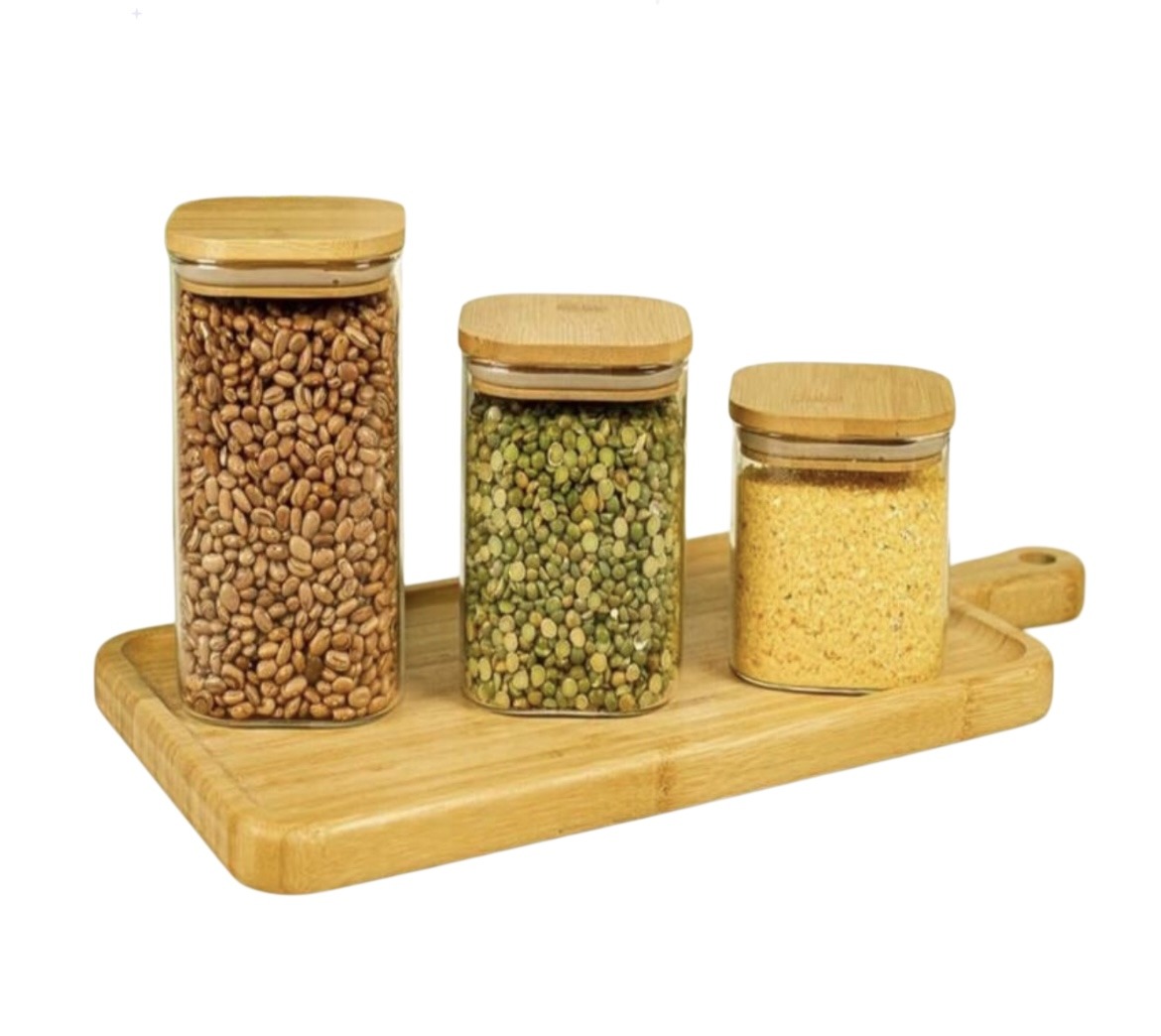 Kit 3 porta condimentos vidro hermético tampa em bambu